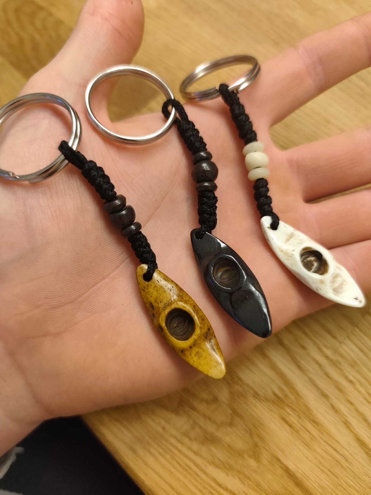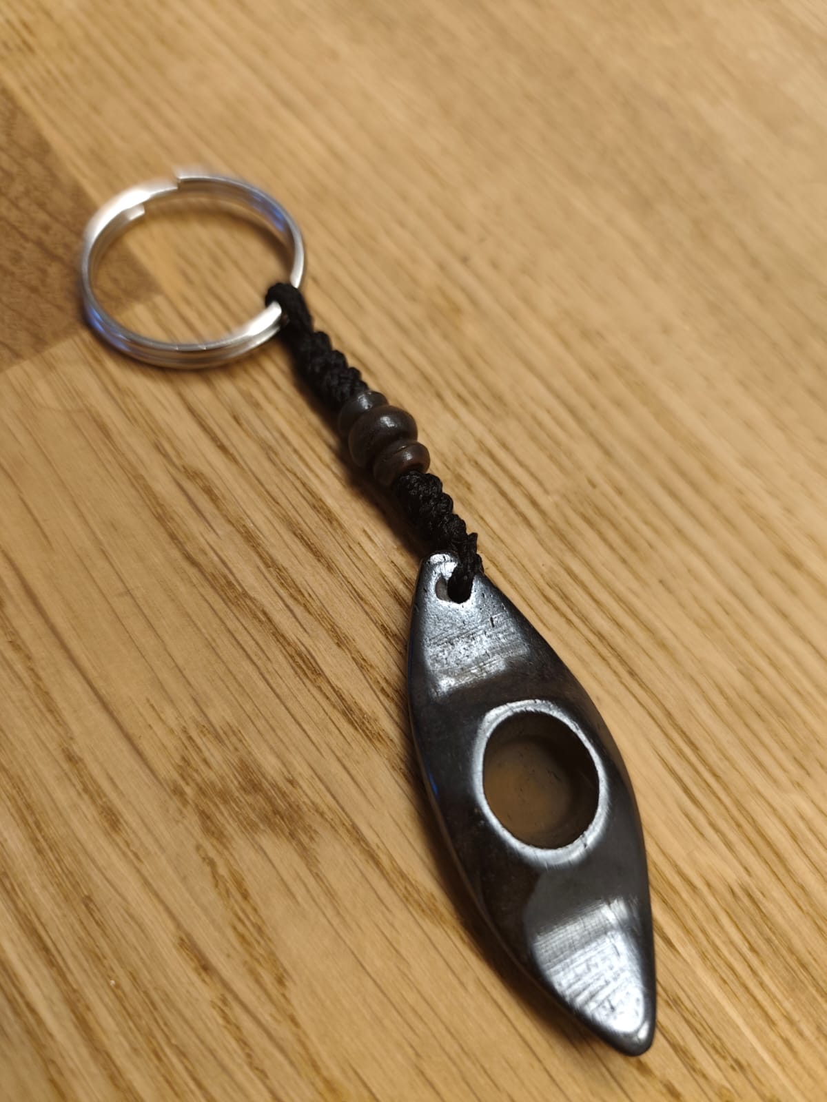 A beautifully handcrafted kayak keyring these keyrings are handmade in Nepal and every one of them is slightly unique in shape and color. They are decorated with beads and with the ring fit on our keys!