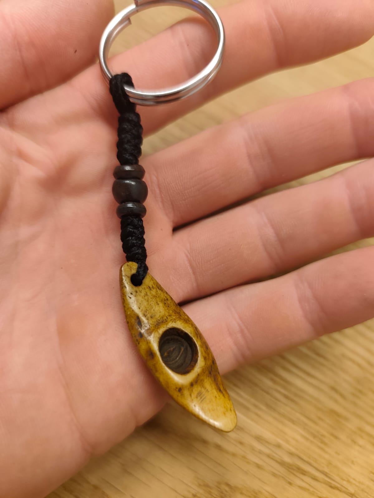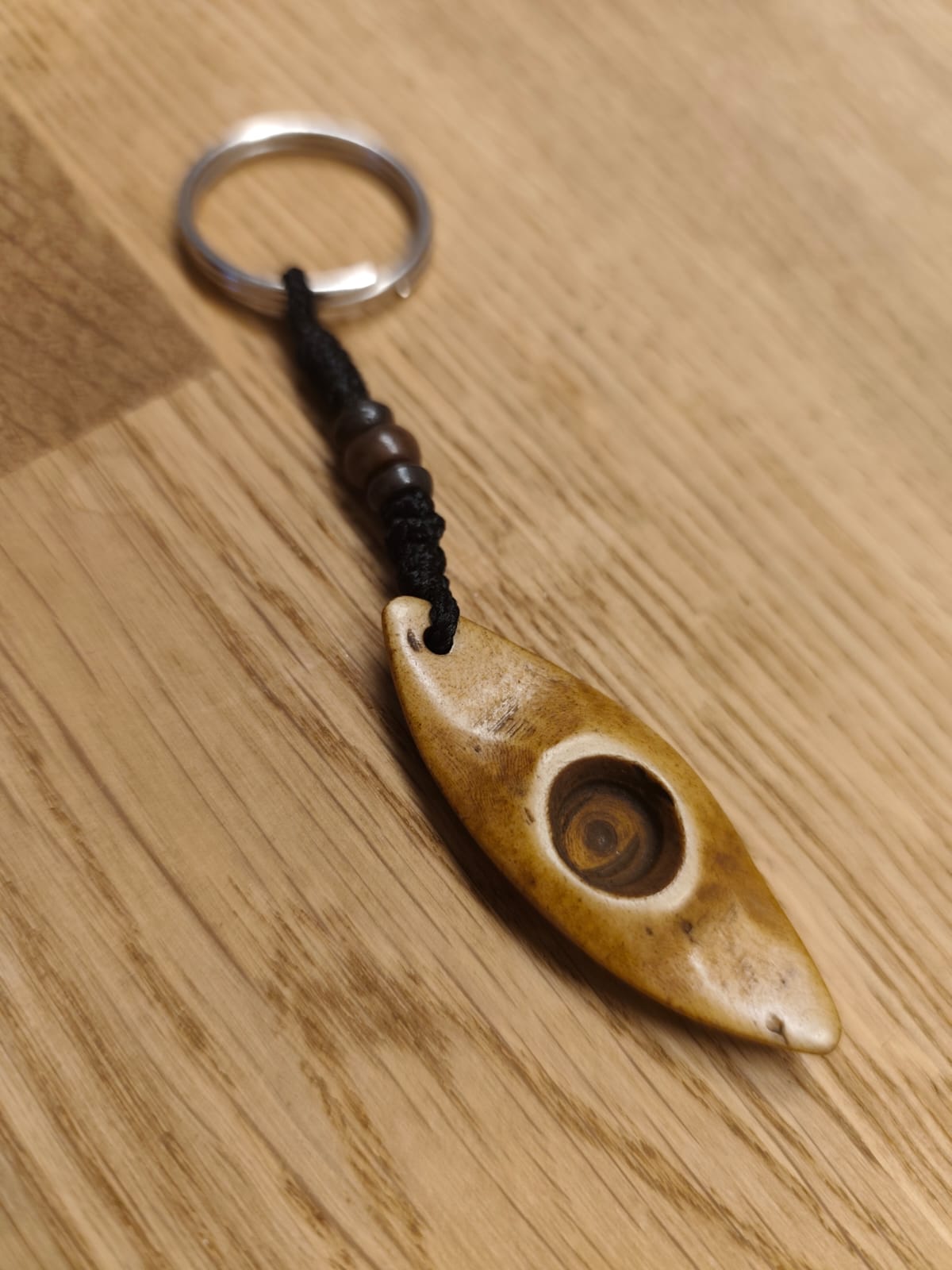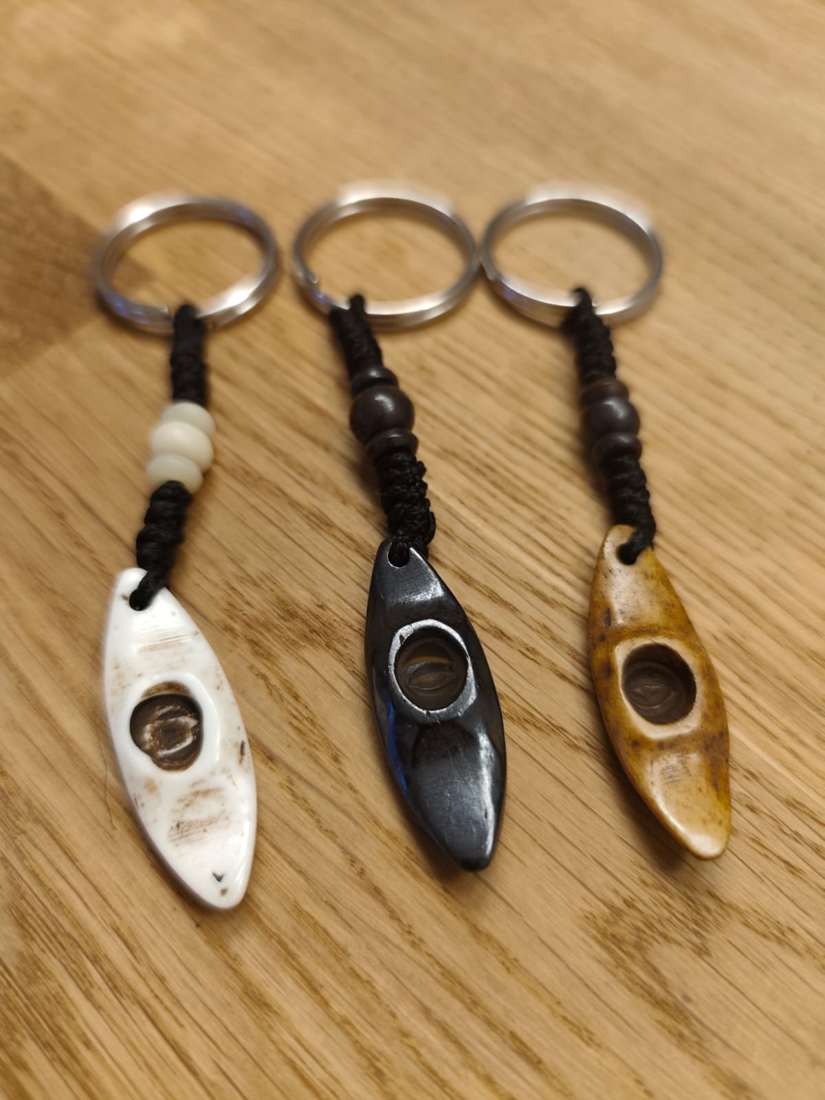 A beautifully handcrafted kayak keyring these keyrings are handmade in Nepal and every one of them is slightly unique in shape and color. They are decorated with beads and with the ring fit on our keys!